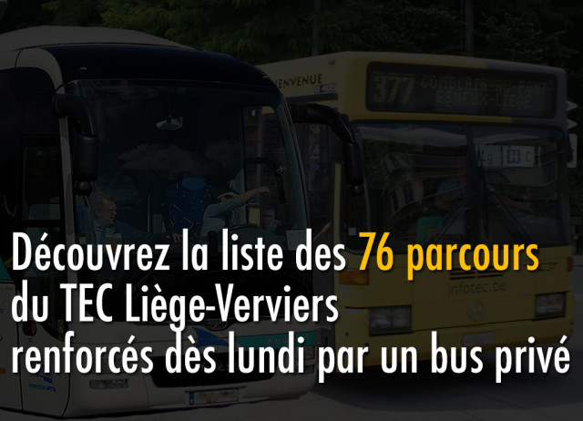 Des bus privés pourront venir renforcer les lignes du TEC dès lundi, jour de la rentrée scolaire après des vacances de Toussaint prolongées. Ces véhicules seront sollicités là où la situation sanitaire locale l'exige et là où les bus sont particulièrement remplis. La mesure, prise fin octobre par le gouvernement wallon, court jusqu'à la fin de l'année scolaire.