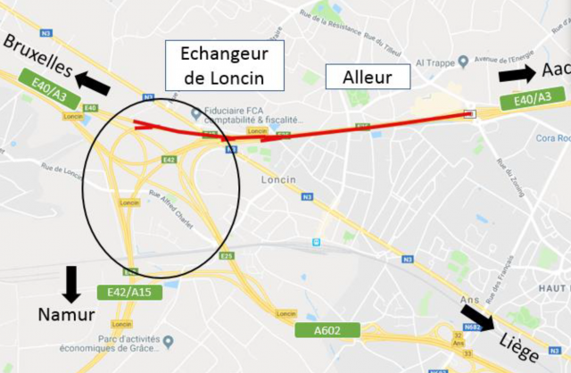 - Les usagers qui viennent de Namur (E42/A15) ne pourront plus emprunter la bretelle de l’échangeur de Loncin vers Aachen (E40/A3)