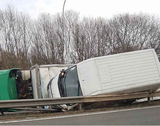 Pour une raison indéterminée, un poids lourd s'est couché sur le flanc à hauteur de la berme centrale. Une camionnette s'est alors retrouvée bloquée, sur le flanc, entre le camion et la rambarde de sécurité. On ignore s'il y a des blessés.