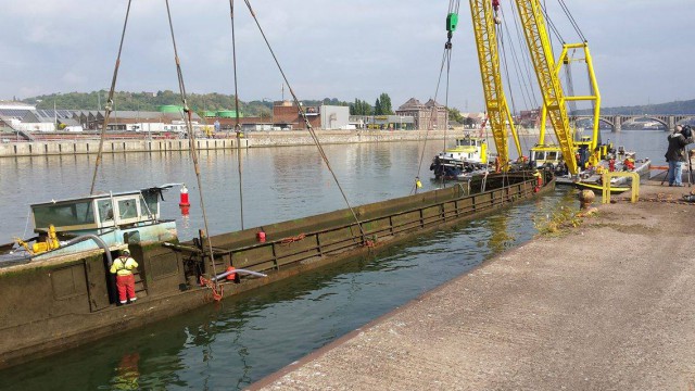 C'est fait, la péniche d'Ougrée est hors de l'eau ! (Vidéo)