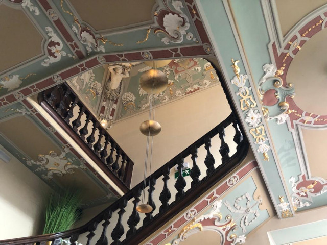 La cage d’escalier est surmontée d'un plafond transformé en 1730. Hercule, vêtu de la dépouille du lion de Némée, est entouré de quatre divinités féminines de l’Antiquité : Vénus, Junon, Diane et Minerve. Des échassiers, retenant dans leur bec de lourdes guirlandes de fleurs, des vasques de fruits, des nids remplis d’oisillons, des oiseaux en plein vol complètent ces scènes.