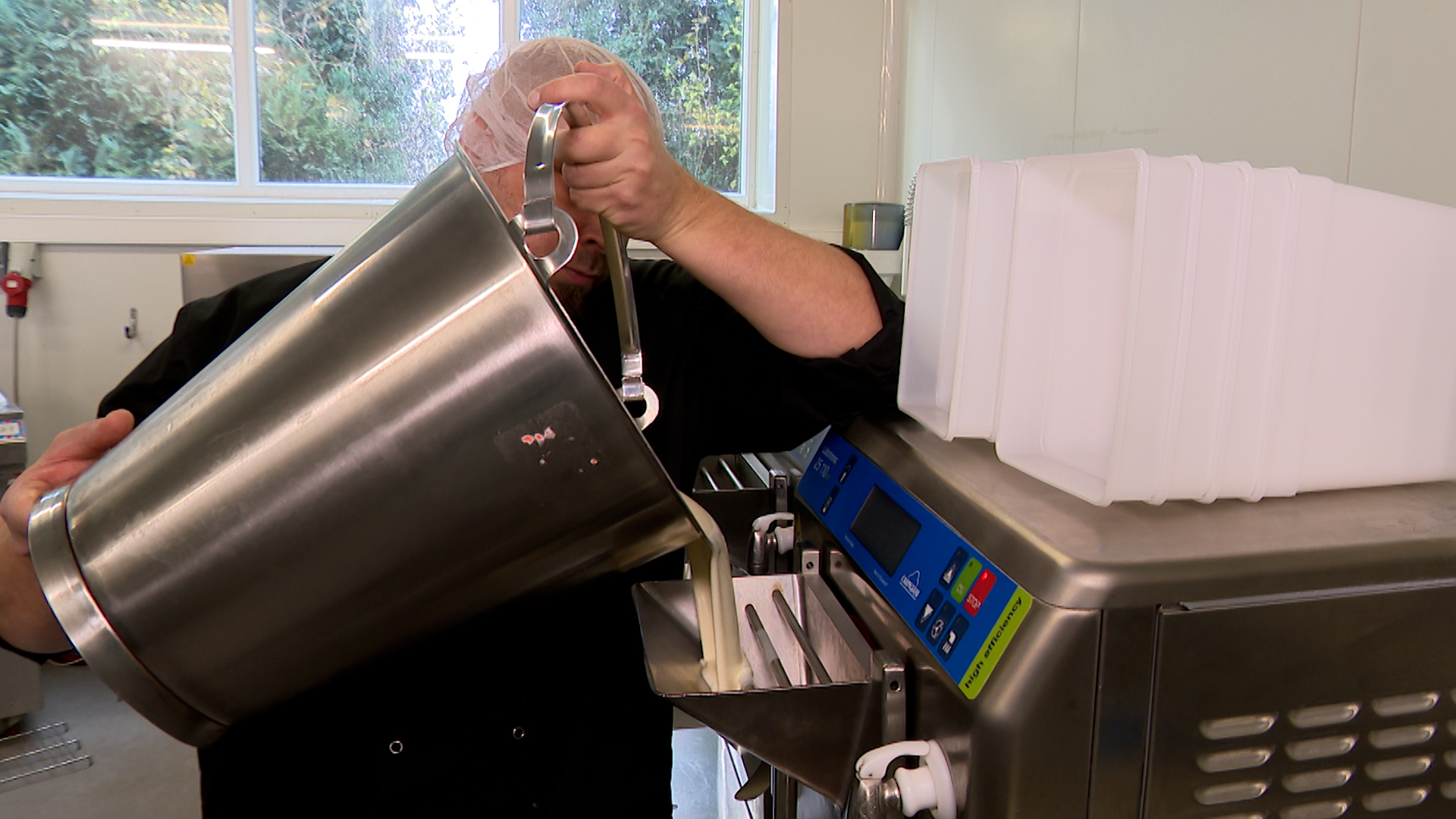"Ici, on reçoit évidemment toutes les matières premières. On les pèse puis on les passe en pasteurisation. Donc ça veut dire qu'on les chauffe à 85 degrés et on les redescend à quatre degrés. Ensuite, elle passe un peu de temps en cuve de maturation, 24 h plus ou moins. Et puis elle passe dans la turbine que vous avez derrière moi, et là la magie opère, la glace devient glace" sourit Antoine De Peyerimhoff administrateur de Capoue.