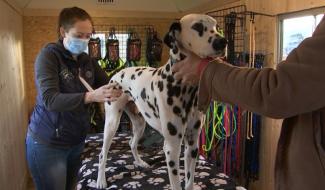 Service ostéopathique canin dans une roulotte aménagée pour la vente d'accessoires canins