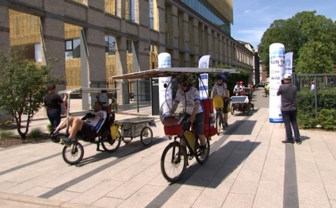 Le peloton du Tour d'Europe en vélo solaire de passage à Seraing